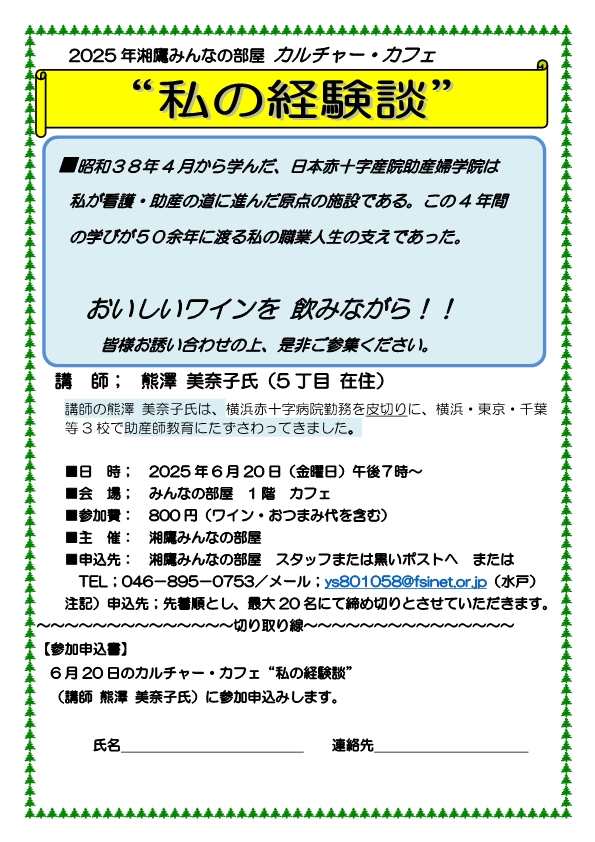 2025年5月25日 / 最終更新日時 : 2025年5月25日 minnanoheya みんなの部屋 カフェ カルチャーカフェ「私の経験談」熊澤美奈子氏 イベント詳細 日付: 2025年6月20日 7:00 PM – 9:00 PM 会場: みんなの部屋 カフェ