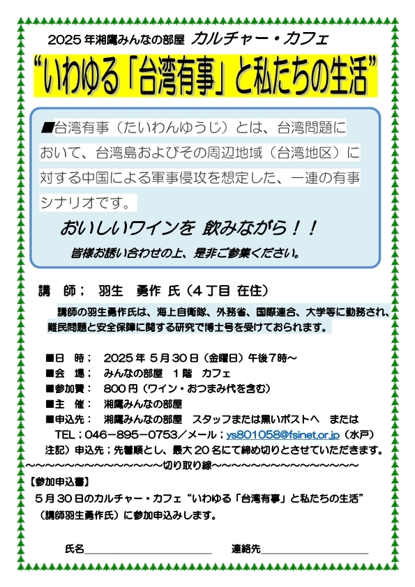 2025年5月2日 / 最終更新日時 : 2025年5月2日 minnanoheya みんなの部屋 カフェ カルチャーカフェ”いわゆる「台湾有事」と私たちの生活” イベント詳細 日付: 2025年5月30日 7:00 PM – 9:00 PM 会場: みんなの部屋 カフェ