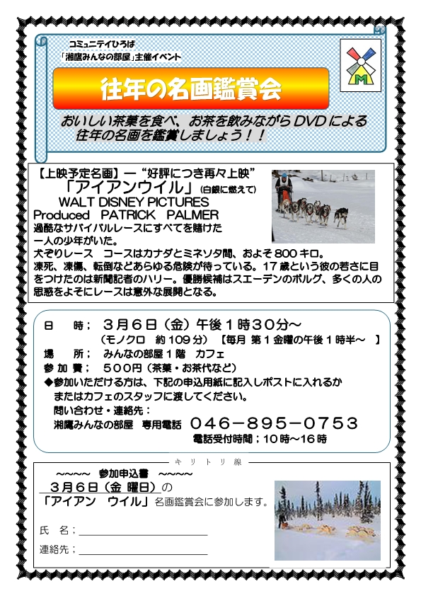 2026年2月8日 / 最終更新日時 : 2026年2月8日 minnanoheya みんなの部屋 カフェ 往年の名画鑑賞会「アイアンウィル」 イベント詳細 日付: 2026年3月6日 1:30 PM – 4:00 PM 会場: みんなの部屋 カフェ