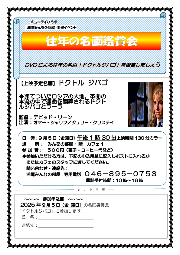 2025年8月25日 / 最終更新日時 : 2025年8月25日 minnanoheya みんなの部屋 カフェ 往年の名画鑑賞会「ドクトルジバゴ」 イベント詳細 日付: 2025年9月5日 1:30 PM – 4:00 PM 会場: みんなの部屋 カフェ