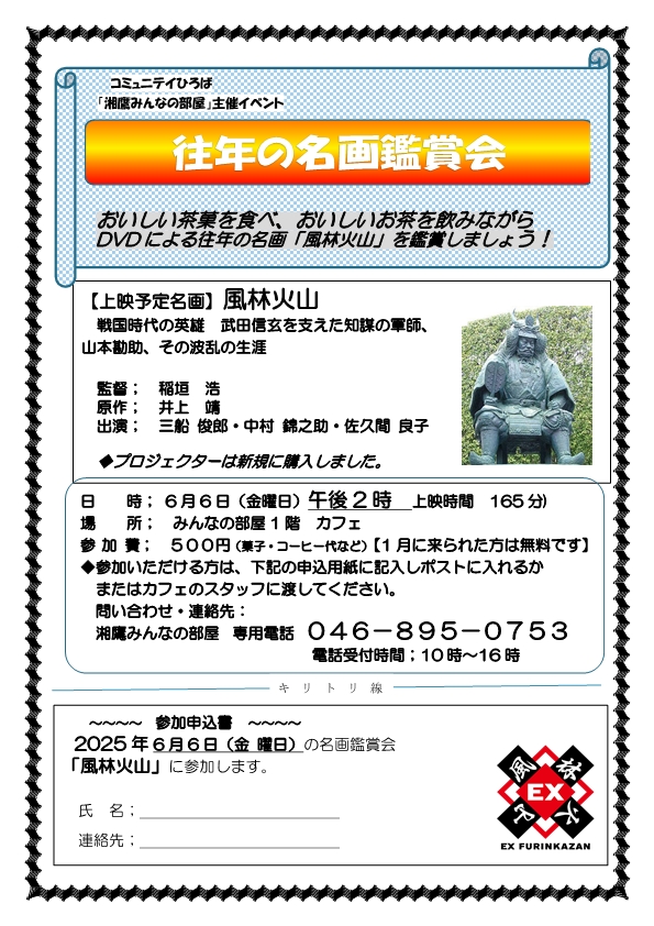 2025年5月24日 / 最終更新日時 : 2025年5月24日 minnanoheya みんなの部屋 カフェ 往年の名画鑑賞会「風林火山」 イベント詳細 日付: 2025年6月6日 2:00 PM – 4:00 PM 会場: みんなの部屋 カフェ